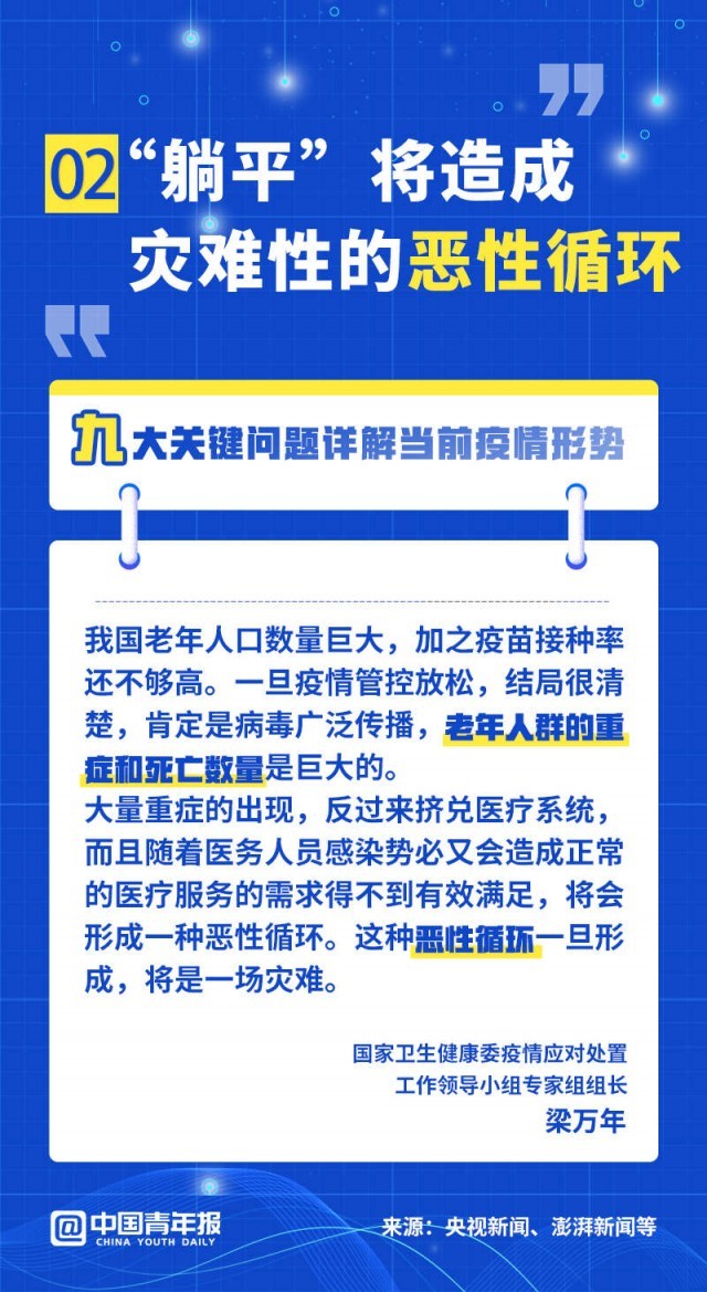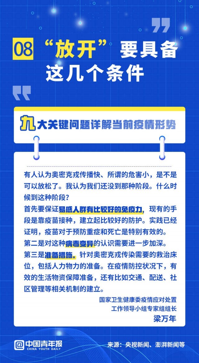 奥密克戎等于大号流感?现在为什么不能全面放开?何时放开?各地应做好哪些防疫准备?动态清零是一成不变的吗?如何理解疫情防控和经济发展的关系?这些近期被广泛关注的关键问题怎么看,一起听听国家卫生健康委疫情应对处置工作领导小组专家组组长梁万年的解答。