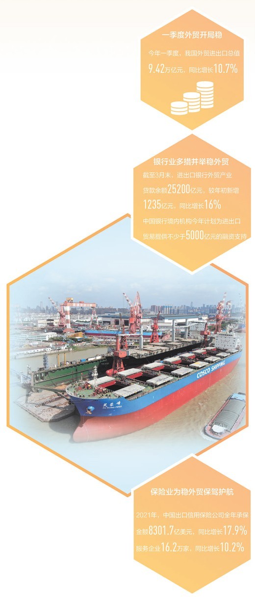 此起彼伏的汽笛声、高效作业的岸吊、有序通行的拖车……今年以来,许多港口码头呈现出一派热火朝天的景象。数据显示,2021年,我国进出口规模首次突破6万亿美元大关。今年一季度,我国外贸进出口总值9.42万亿元,同比增长10.7%。