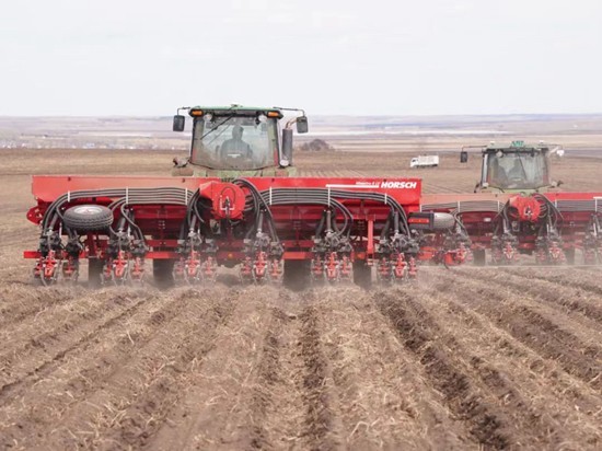在黑龙江省北大荒农垦有限公司九三分公司鹤山农场第一管理区5号地,大马力播种机车正在田野间穿梭作业。