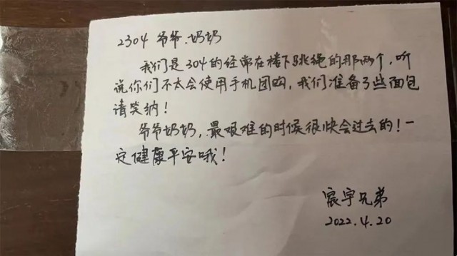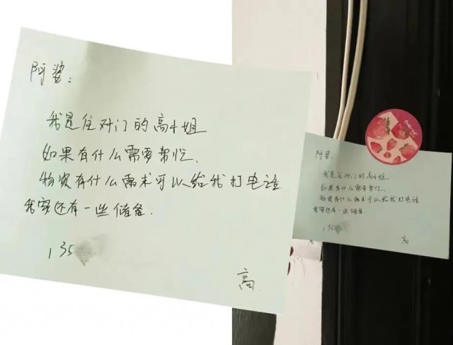 高小姐给对门80岁的上海阿婆留了字条,阿婆收到字条后,回写字条表达感谢。还将自己家的蔬菜洗干净挂出来共享,高小姐每每听见阿婆收音机里传来的越剧声,觉得封控也不算太坏。夜总会过去、灯会再亮起来。