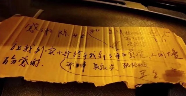 小哥们自发的想说些感谢的话由于没有纸张,就撕了一个纸箱联名写了封感谢信。