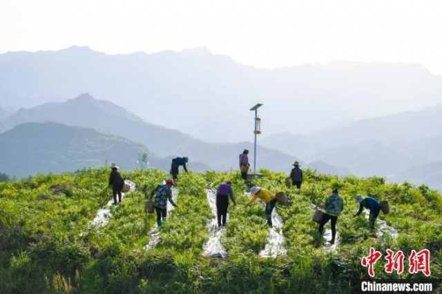 在白马山天门郡莓茶基地,挎着背篓的村民们忙碌着采茶。 杨华峰 摄