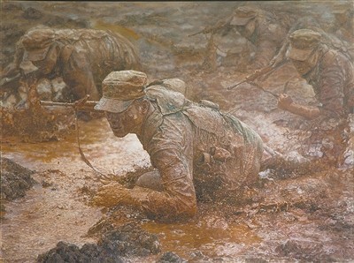 军营的青春,尤能体现青年一代不怕苦、不畏难、不惧牺牲的精神。在军旅题材美术创作中,不少作品以军营的热血青春诠释成长主题。例如,陈林油画《钢与泥·前进》,表现了新兵在泥水中匍匐前进的日常训练,真实的情景刻画,凸显热血男儿的铮铮铁骨和保家卫国的坚定信念。李金朵、詹清雨的中国画《女兵》,则通过射击训练,展现“巾帼不让须眉”的青年女兵形象。透过这些身影,人们可以充分领略当代青年奋发向上的风采。