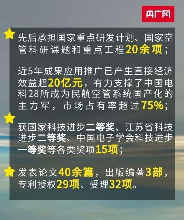 其带领团队突破广域流量时隙最优调配等关键技术,支撑研制国内民航第一套国家级、区域级空中交通流量管理原型系统,达到国际领先水平。突破的空域信息建模与灵活使用等关键技术,支撑首套军民航空域管理信息融合原型系统研制,于民航华东空管局(含江苏)、东部战区试点运行,有力支撑了国家空域精细化管理试点和长三角一体化战略。
