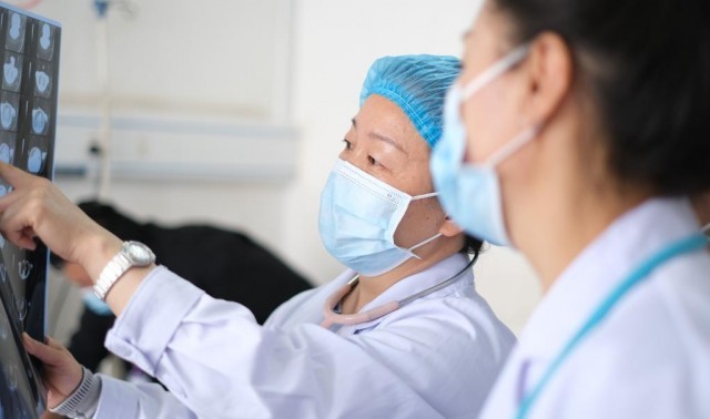4月25日,青海省妇女儿童医院医生、青南支医队员孙敬(左)给青海省玉树藏族自治州人民医院医生讲解患者胸部CT。(新华社记者央秀达珍 摄)