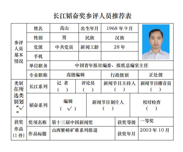 高山同志从1998年4月调入中国青年报社总编室起,一直严谨求实,兢兢业业,坚守在采编一线,做报纸的“排雷员”“守门员”。每年3月的两会报道都是报社一年里最重要的战役性报道,从2003年至今,该同志参与了全部的两会报道任务,其中8年担任两会特刊一版编辑。两会报道一般只有十几天时间,但参加报道的编辑记者人人都会感到“累得脱了一层皮”。该同志还参与了抗击非典、四川汶川特大地震、北京奥运会、上海世博会、北京冬奥会等重大报道,参与了神舟系列飞船发射的报道等等。