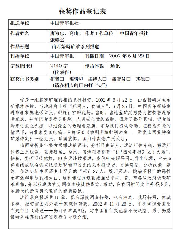 1、2003.10 参与编辑的“山西繁峙矿难系列报道”获第十三届中国新闻奖(2002年度)系列报道一等奖;