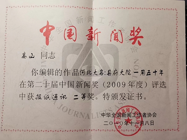 5、2010.11编辑的《河北大名:县府大院一用五十年》获第二十届中国新闻奖(2009年度)报纸通讯二等奖;