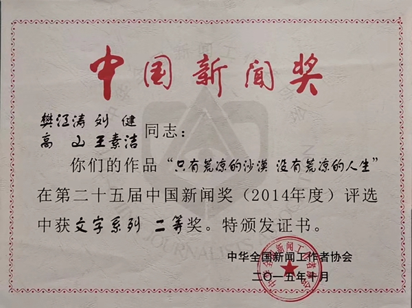 6、2015.10 参与编辑的《只有荒凉的沙漠 没有荒凉的人生》获第二十五届中国新闻奖(2014年度)文字系列二等奖;
