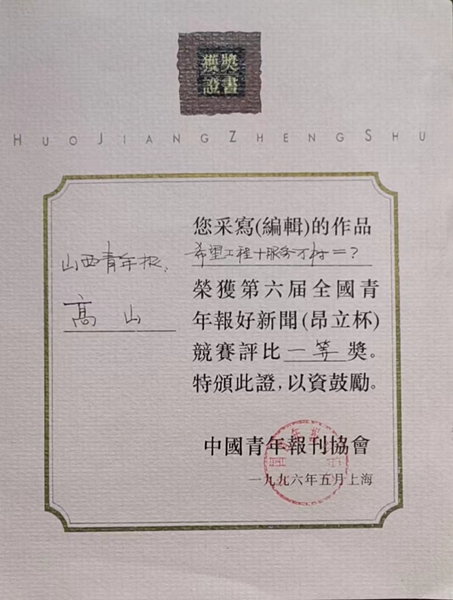 1、1996.5 采写的作品《希望工程+服务万村=?》获第六届全国青年报好新闻竞赛一等奖,(中国青年报刊协会);