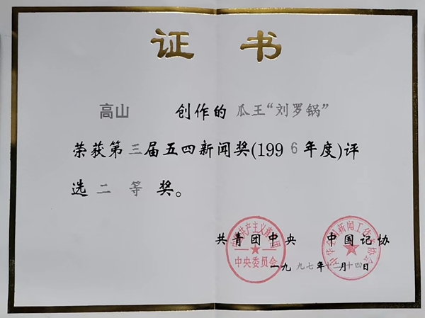 2、1997.12 采写的作品《瓜王“刘罗锅”》获第三届五四新闻奖(1996年度)二等奖,(共青团中央、中国记协) ;