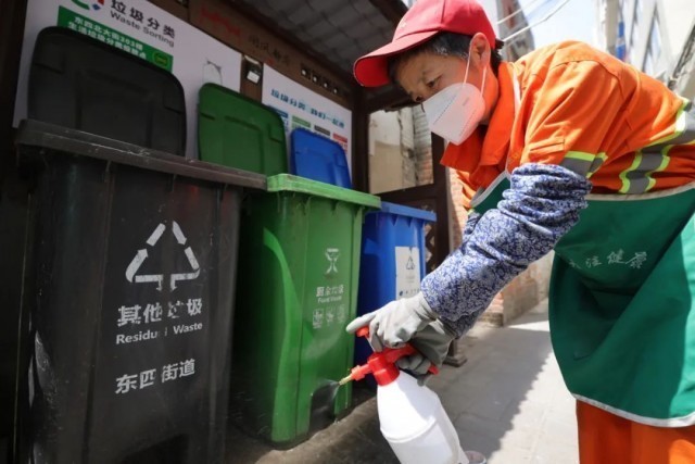 东四街道对辖区内垃圾清运处理,垃圾桶站部位消毒。