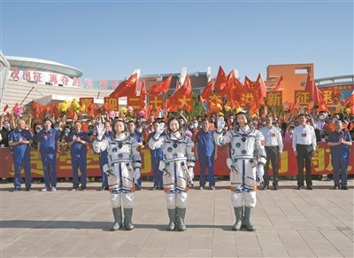 7时50分许,身着舱内航天服的航天员陈冬、刘洋、蔡旭哲,迎着朝阳走出问天阁。以这条出征路为起点,中国航天员将再度开启长达6个月的太空之旅。