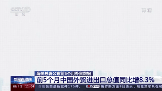 海关总署今天(9日)公布,今年前5个月,我国外贸进出口总值16.04万亿元,同比增长8.3%。