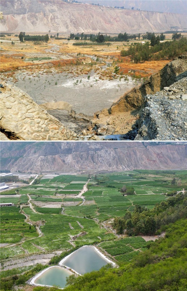 这是一张拼版照片,上图为:2013年蒋家沟出口段附近发生泥石流后的景象(资料照片);下图为:蒋家沟出口段附近生态修复治理后的景象(6月1日摄,无人机照片)。新华社记者 胡超 摄