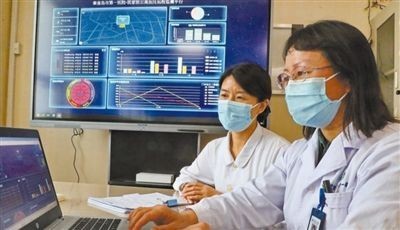 河北省秦皇岛市第一医院心内科三病区主任刘丽(右)和护士长崔蕊依托“互联网+大数据”,在电脑上远程查看患者健康数据。