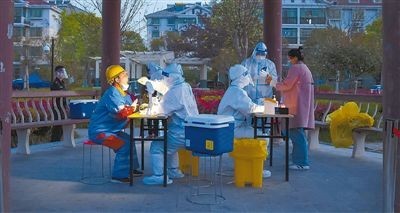 江苏省宿迁市宿城区通城山庄小区,医务工作者在晨曦中为居民做核酸检测。