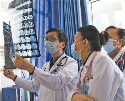 在西藏自治区人民医院,北京大学第一医院援藏医生程渊(左)正和当地医生交流业务。