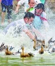 在江苏淮安洪泽区岔河镇其虎村,游客和村民一起参加抓鸭比赛。新华社发