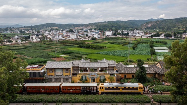 7月1日,游客乘坐建水米轨小火车来到乡会桥站游览(无人机照片)。 新华社记者胡超 摄