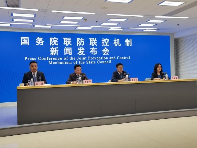 国务院联防联控机制新闻发布会现场。(新华社记者 宋晨 摄)