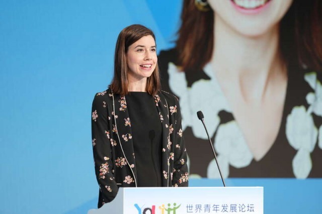 7月23日,在世界青年发展论坛“包容和公平的优质教育”主题论坛上,世界经济论坛北京代表处大中华区首席代表艾瑞碧致辞。中青报·中青网记者李隽辉/摄