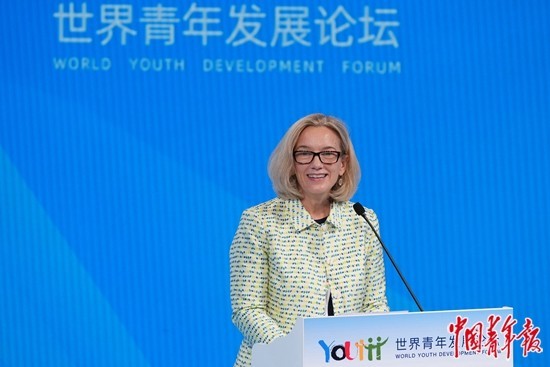 7月22日,世界青年发展论坛就业创业主题论坛上,联合国人口基金驻中国代表康嘉婷致辞。 中青报·中青网记者 李隽辉/摄