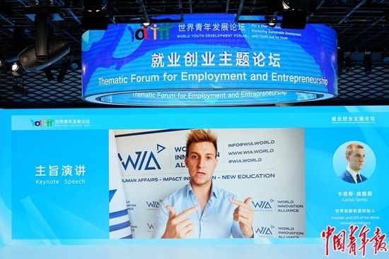 7月22日,世界青年发展论坛就业创业主题论坛上,世界创新联盟创始人卡洛斯·森提斯通过视频发表主旨演讲。 中青报·中青网记者 李隽辉/摄