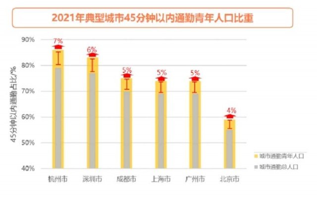 2021年典型城市45分钟以内通勤青年人口比重。摘自《2022年度中国主要城市通勤监测报告》