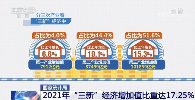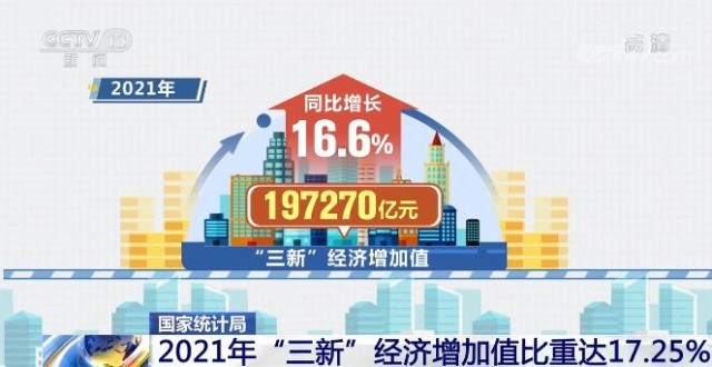 经核算,2021年 “三新”经济增加值为197270亿元,比2020年增长了16.6%,相当于国内生产总值GDP的比重为17.25%,比2020年提高0.17个百分点。