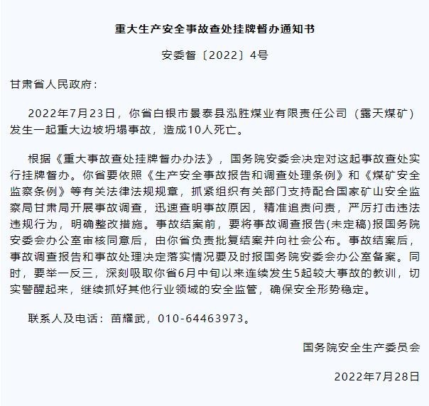 根据《重大事故查处挂牌督办办法》,国务院安委会决定对这起事故查处实行挂牌督办。甘肃省要依照《生产安全事故报告和调查处理条例》和《煤矿安全监察条例》等有关法律法规规章,抓紧组织有关部门支持配合国家矿山安全监察局甘肃局开展事故调查,迅速查明事故原因,精准追责问责,严厉打击违法违规行为,明确整改措施。事故结案前,要将事故调查报告(未定稿)报国务院安委会办公室审核同意后,由甘肃省负责批复结案并向社会公布。事故结案后,事故调查报告和事故处理决定落实情况要及时报国务院安委会办公室备案。