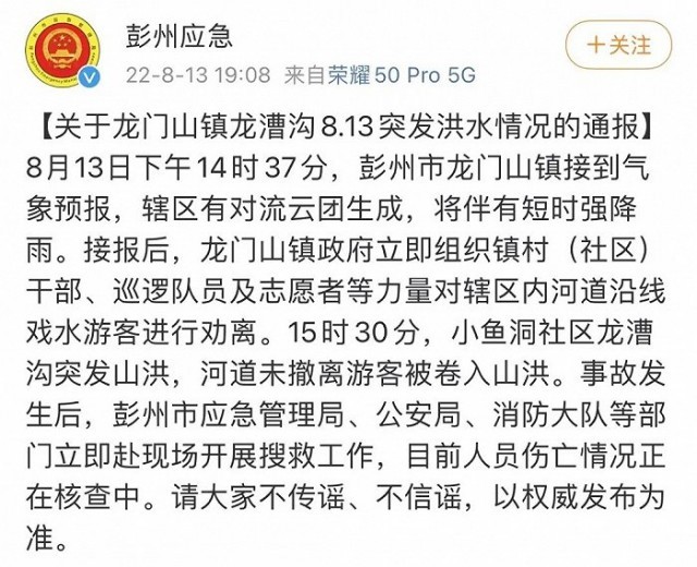 8月13日下午14时37分,彭州市龙门山镇接到气象预报,辖区有对流云团生成,将伴有短时强降雨。接报后,龙门山镇政府立即组织镇村(社区)干部、巡逻队员及志愿者等力量对辖区内河道沿线戏水游客进行劝离。15时30分,小鱼洞社区龙漕沟突发山洪,河道未撤离游客被卷入山洪。事故发生后,彭州市应急管理局、公安局、消防大队等部门立即赴现场开展搜救工作,目前人员伤亡情况正在核查中。请大家不传谣、不信谣,以权威发布为准。