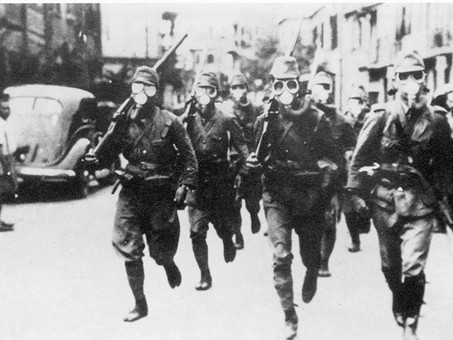 ▲淞沪会战中穿戴防毒面具的日军(图片来源:黑龙江省社会科学院)