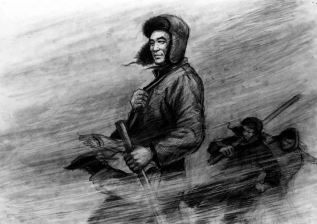 在一个风雪之夜,焦裕禄带领县委委员来到兰考车站,面对被灾荒逼得背井离乡的同胞,意识到必须要领导群众,战胜灾害,改变兰考面貌。新华社发(当年的漫画,黎冰鸿作)