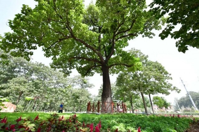 2017年8月9日,游客从兰考焦裕禄干部学院门口的“焦桐”下走过。这棵泡桐是焦裕禄当年亲手种下,被人们称为“焦桐”。