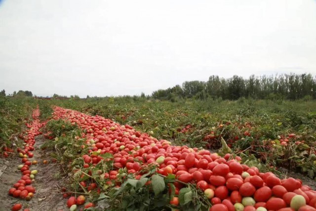 近日,在九师一六二团五连李洪的地里,一辆番茄采收机正来回地穿梭,职工们有序地将番茄采收机倾倒筛出的番茄分拣后堆放整齐,远处七八辆拉运车一字排开,准备将装满番茄的货箱运往塔城市番茄制品公司加工制酱。