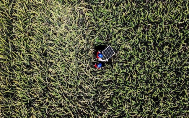 国网磐安县供电公司工作人员在农田中对设备进行检查。(受访者供图)
