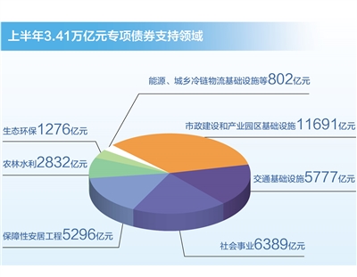 统计显示,上半年已发行的3.41万亿元专项债券中,支持市政建设和产业园区基础设施11691亿元、交通基础设施5777亿元、社会事业6389亿元、保障性安居工程5296亿元、农林水利2832亿元、生态环保1276亿元以及能源、城乡冷链物流基础设施等802亿元。专项债券资金在惠民生、补短板等方面的作用日益显现。