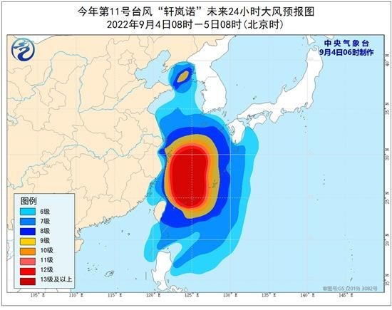 中央气象台预计,今天“轩岚诺”将以每小时15-20公里的速度向北偏西方向移动,强度将逐渐加强,最大强度可达超强台风级(16级,52-55米/秒),并逐渐向浙江东北部近海靠近,今天夜间到明天早晨将在浙江近海海面北上,明天上午开始转向东北方向移动,趋向朝鲜半岛南部到朝鲜海峡一带。