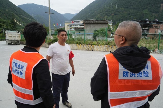 9月7日,四川石棉县王岗坪乡挖角村党总支书记王德清与水利局抢险人员沟通抢修水管方案。新华社记者 薛晨 摄