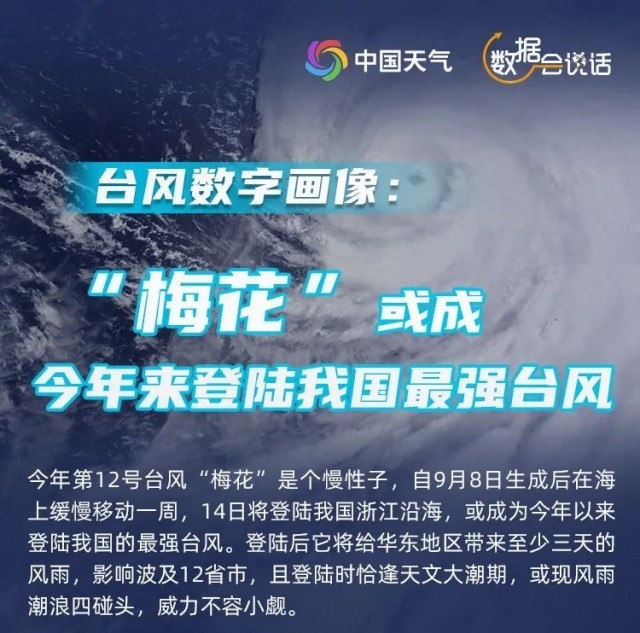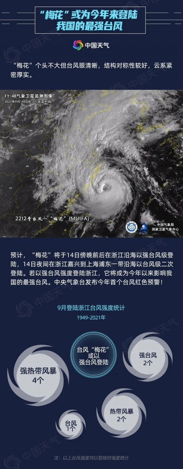 今年第12号台风“梅花”是个慢性子,自9月8日生成后在海上缓慢移动一周,预计今日(14日)傍晚前后在浙江沿海以强台风级登陆,今日夜间在浙江嘉兴到上海浦东一带沿海以台风级二次登陆。若以强台风强度登陆浙江,或成为今年以来登陆我国的最强台风,中央气象台发布今年首个台风红色预警。