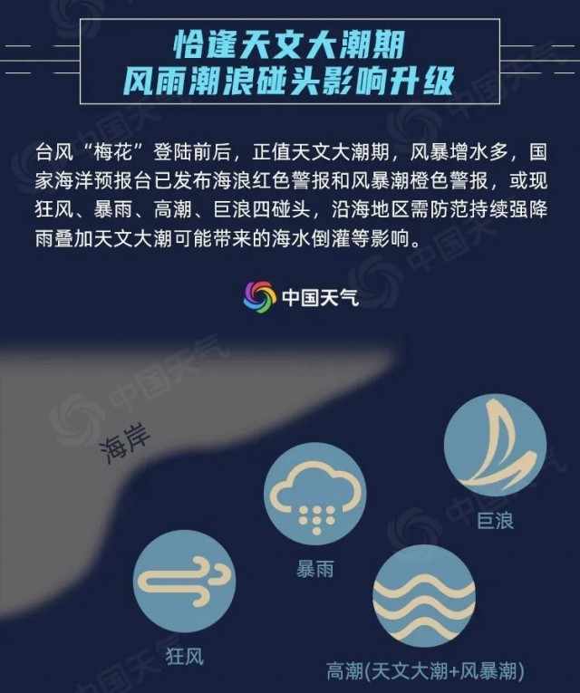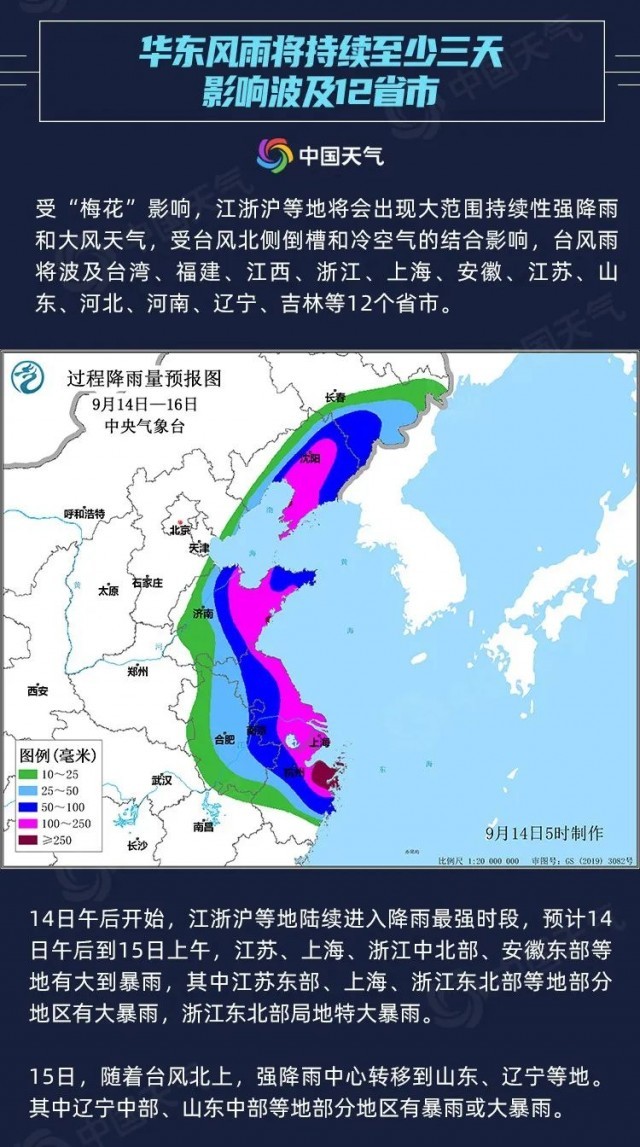 登陆后它将给华东地区带来至少三天的风雨,后续还将北上影响东北部分地区,风雨范围波及12省市,且登陆时恰逢天文大潮期,或现风雨潮浪四碰头,威力不容小觑。今日午后,江浙沪即将进入风雨最强时段。
