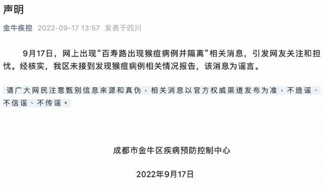 百寿路出现猴痘病例并隔离?成都金牛区疾控:系谣言