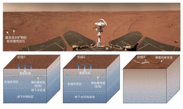 图2 祝融号在着陆区发现富含含水矿物的板状硬壳岩石及其在地下水作用下的形成过程示意图