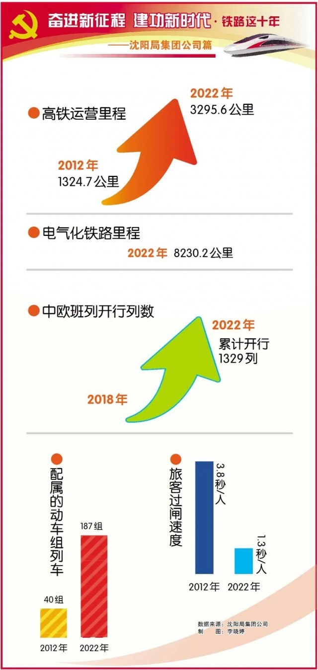 党的十八大以来,国铁企业以习近平新时代中国特色社会主义思想为指导,踔厉奋发、勇毅前行,肩负交通强国铁路先行历史使命,推动铁路事业取得了历史性成就。密织路网,释放通道能力;全力以赴,保障国计民生;装备升级,助推铁路发展;红色教育,提升“细胞”活力……风涌长白山,浪卷辽河水。新时代新征程,中国铁路沈阳局集团有限公司将继续乘势而上,奋力书写高质量发展新篇章,努力在服务新时代东北振兴中展现更大作为。