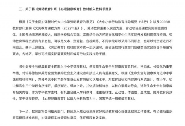 2022年,教育部印发义务教育课程方案和课程标准(2022年版),将劳动从综合实践活动课程中独立出来,并明确劳动课程性质、目标、学生劳动素养发展要求等,对课程内容范围、实施方式等提出建议。今年秋季学期起,劳动课正式成为中小学的一门必修课。