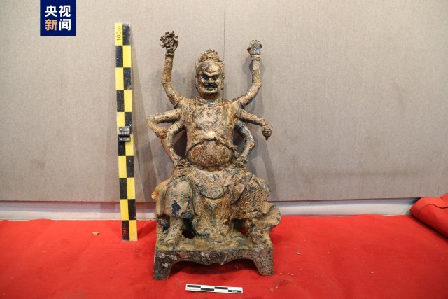 此外,本次考古在州桥东侧河神庙基址旁还发掘出了三尊贴金铜造像,它们高80厘米至100厘米,初步判断为河神庙中神祇金龙四大王等造像,三尊造像不可多得,极为珍贵。