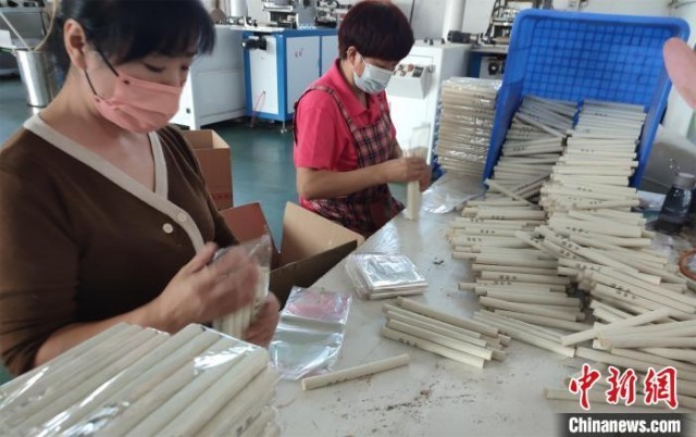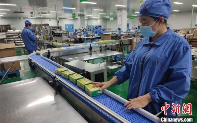 工人在车间里包装艾柱。 王宇 摄