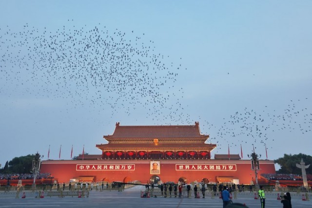 礼毕,国旗升至旗杆顶端,万羽和平鸽翱翔天空,绕着广场盘旋,在军乐团《歌唱祖国》的乐曲中,“祖国万岁!”“我爱你祖国!”“生日快乐!”呐喊声此起彼伏,大家久久不愿离去。