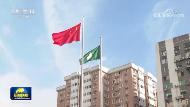 澳门特别行政区政府今天也在金莲花广场举行升旗仪式。随着国歌奏响,全场肃立,注视五星红旗和澳门特区区旗冉冉升起。不少澳门市民和游客纷纷在广场合影留念。